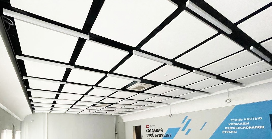 Решение: Каждая панель работает как звукопоглотитель, сокращая время реверберации. Их распределение по потолку (особенно в шахматном порядке) эффективно "гасит" эти отражения по всей площади.